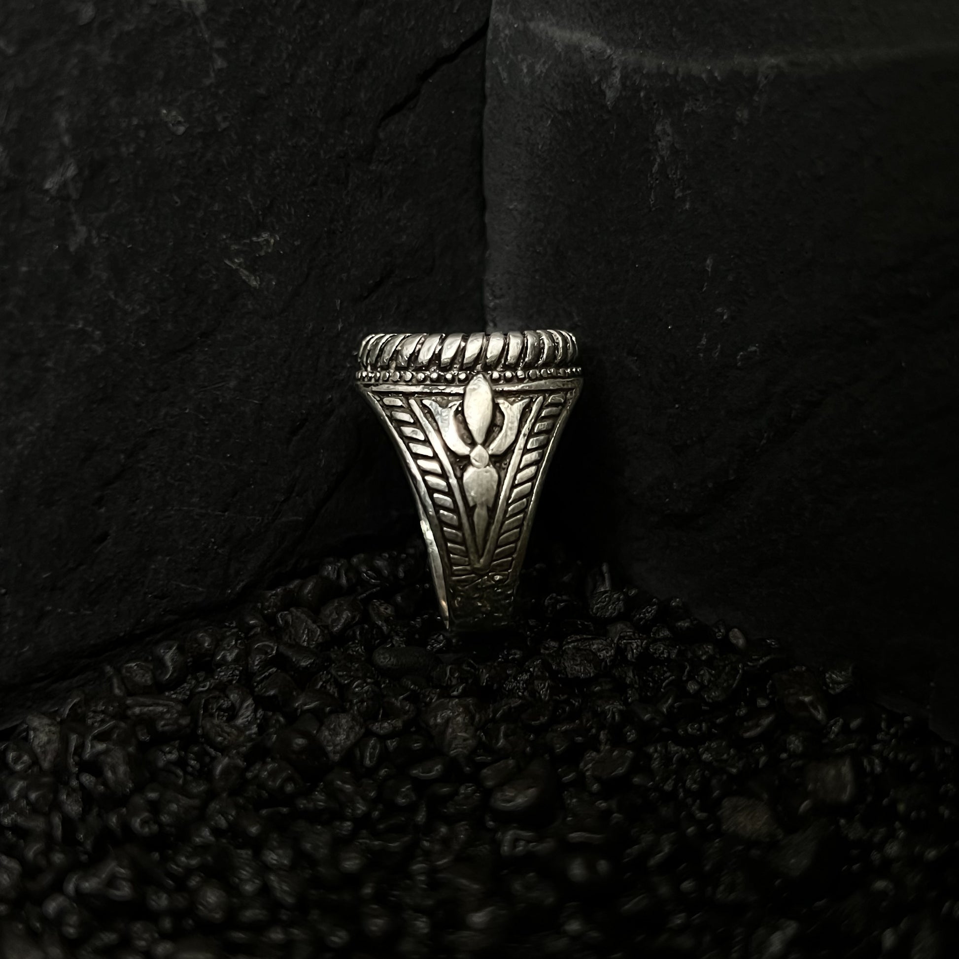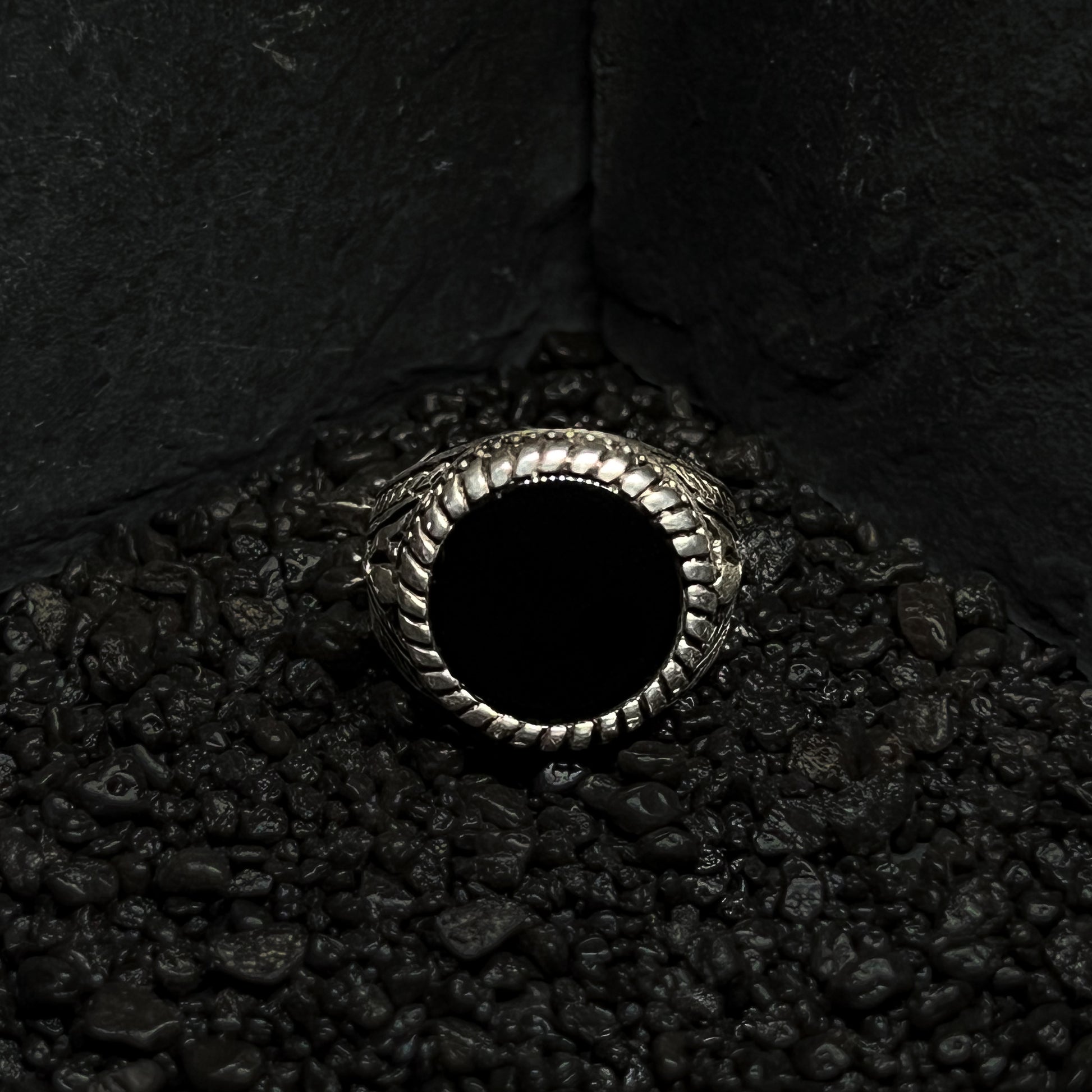 A stunning silver band adorned with a sleek black gem. Intricate details and fine craftsmanship enhance its timeless allure, making it a symbol of sophistication and mystery.