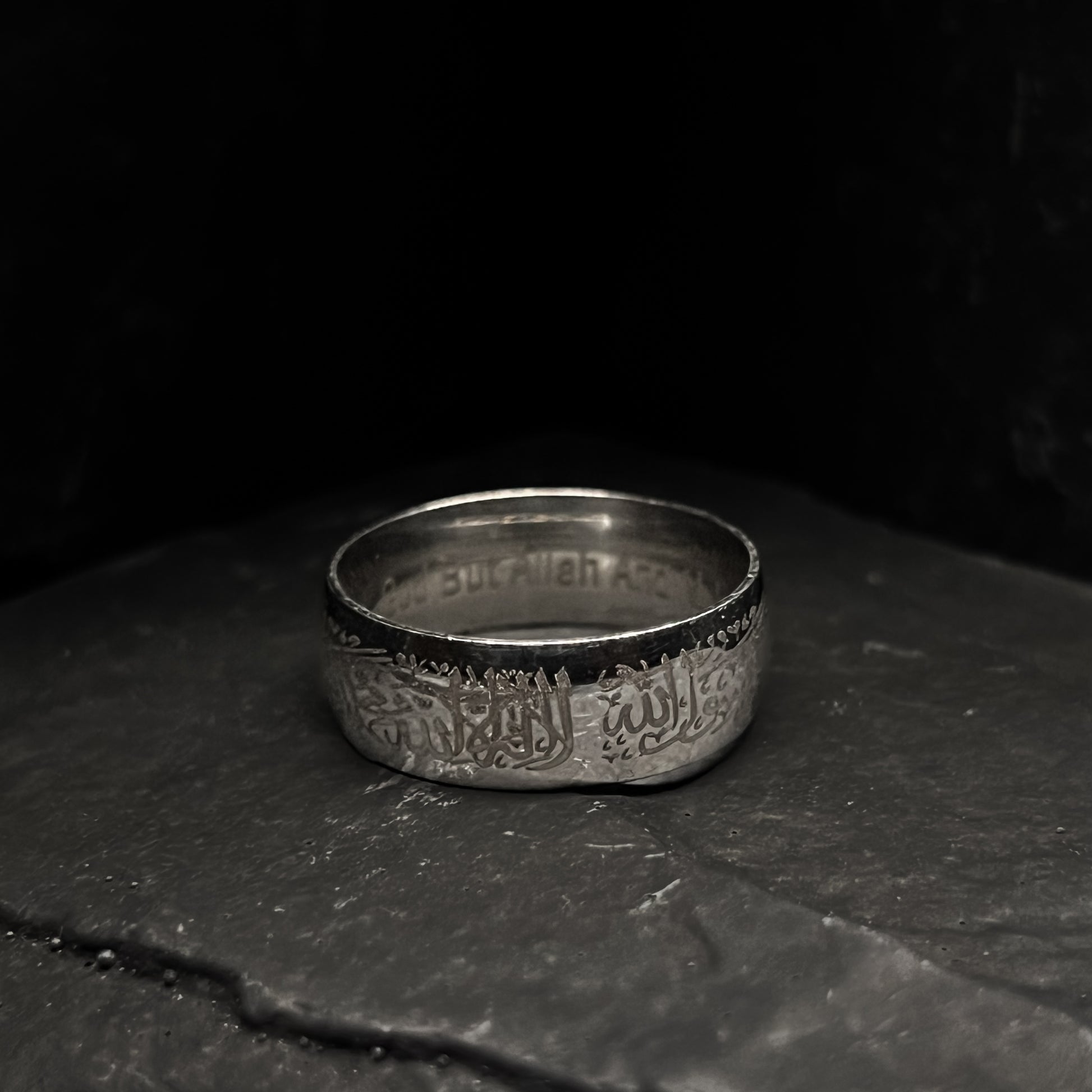 The Shahda Ring is a powerful symbol of faith, featuring the Arabic Shahada inscribed on a sleek, rounded steel band. Crafted with precision, the durable and polished design highlights the beauty of the sacred words, embodying strength and devotion. This timeless piece serves as a meaningful expression of belief, combining elegance with spiritual significance.